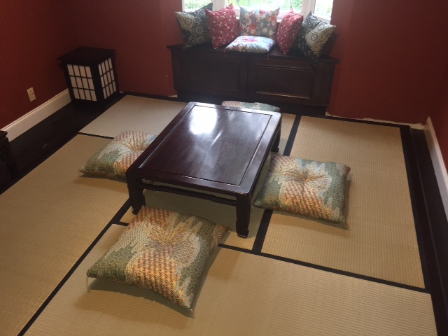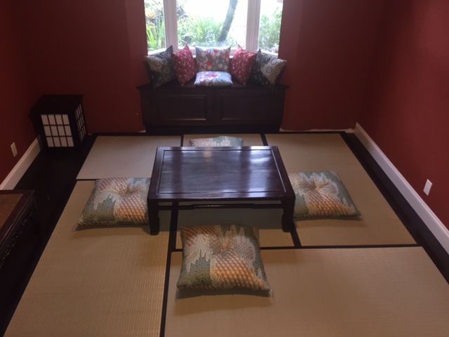 Also, notice the custom-made zabuton (seating cushions) around the traditional table and the custom kushyon (cushions) in the window seat we made for him as well. Perfect finishing touches!